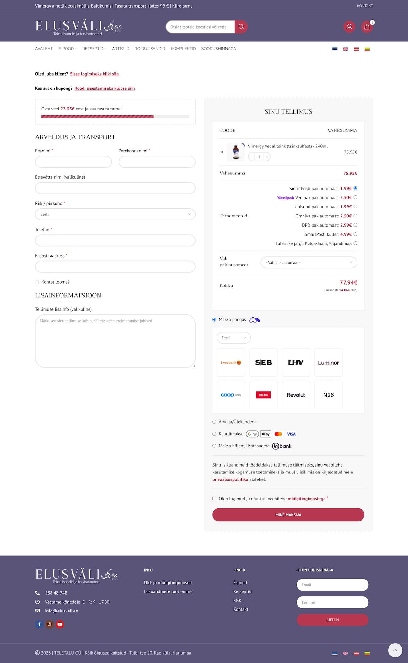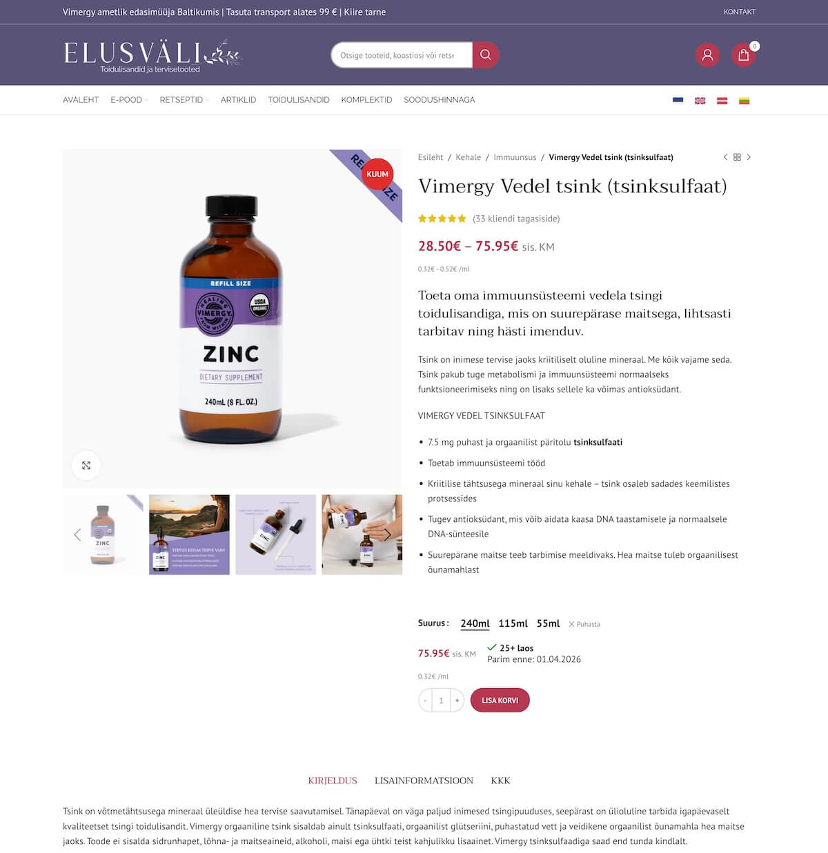 Uus e-poe lahendus toetab Elusväli kasvu, võimaldades paremat toodete haldust, mitmekeelse turu (Eesti, Läti, Leedu) teenindamist ning efektiivsemat filtreerimist vitamiinide, kiirtestide ja loodustoodete kategooriates. Lisaks töötasime välja spetsiaalse tootelehe layout’i, mis esitleb vitamiinide koostisosi, mõju ja kasutusviise selgelt ja kaasahaaravalt.