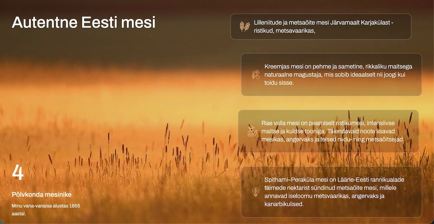 Valmislahendus toetab Mesilastelugu.ee brändi kõiki peamisi suundi: hariduslikud materjalid, “Minu lugu”, erinevate sihtrühmade lehed, blogi ning e-poe müügivõimekus. Tulemuseks on puhas ja professionaalne veeb, mis toob mesinduse loo inimestele lähemale ning võimaldab lihtsalt tooteid tellida.